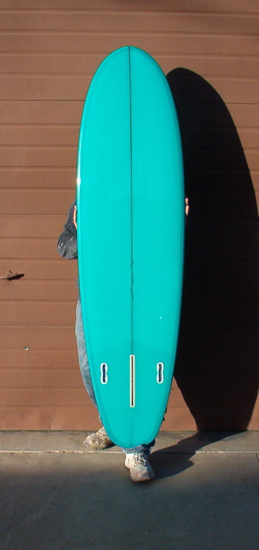 At the end of the longboard era, Hansen used two outer glue lines and a tapered half-stringer to good effect. The front half of the board was flexible when trimming forward, and the glue lines gave their boards a distinct look.
